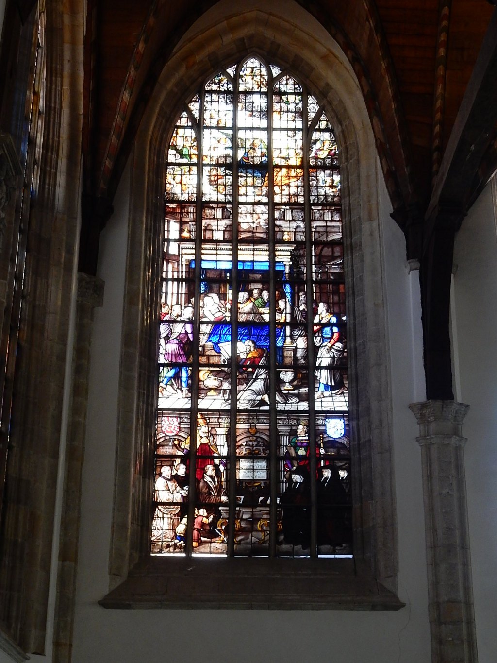 Our next actual stop this morning was at Oude Kerk . It stands in the middle of the Red Light District, was originally built around 1300 and is said to be the oldest building in Amsterdam. It is currently under renovation (maybe that's an ongoing state) so a lot of things have been removed but we saw Saskia's (Rembrandt's wife) grave, the organs, paintings on the ceiling, and beautiful stained glass.