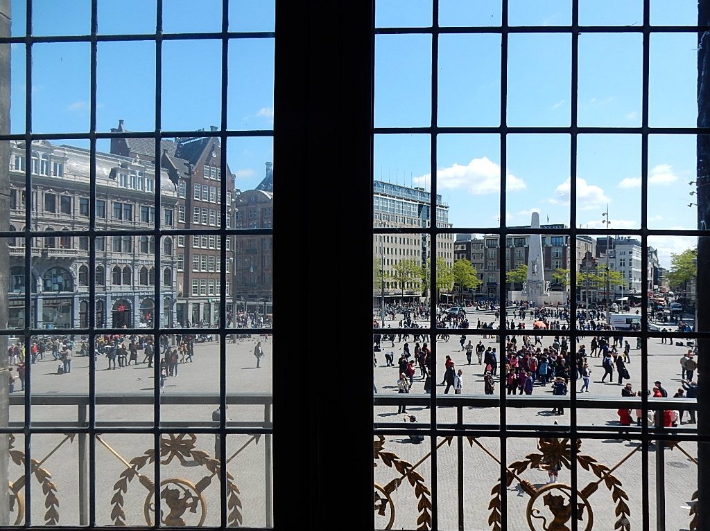 This was the only place we visited where they took away our purses – we could take pictures without flash but had to check our purses. They have free audio tours that were interesting to listen to but we were hungry, so just got the gist of each room and admired some of the 51 chandeliers. The Citizens' Hall is shown at the left, with an elaborately painted ceiling and marble walls with numerous carvings and statues; the center picture is one of the Chambers that is open for public viewing and on the right a view of the Dam Square out one of the Palace windows.