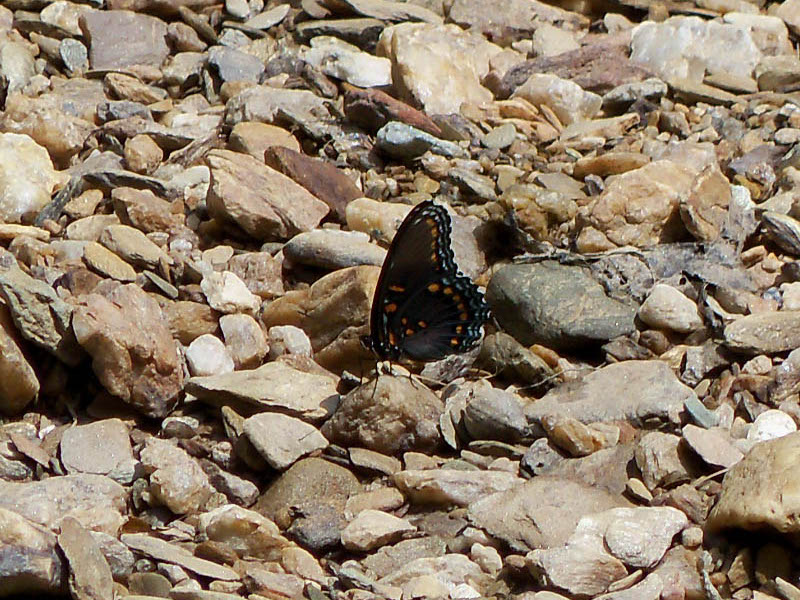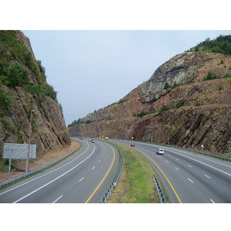 a little and left around 9 AM. Saturday August 13: Crossing into Maryland is where we finally got into a scenic route! The first picture (above, right) is just beyond Exit 4 near Friendsville, MD. That has to be a branch of the Youghiogheny River. In the picture above left, you can see the 340 foot notch in the Allegheny Mts just west of Hancock known as the Sidling Hill Cutout. The two pictures below were taken at a rest area there at Sidling Hill: the cutout itself and a praying mantis who was as interested in me as I was in him. ![]() So,