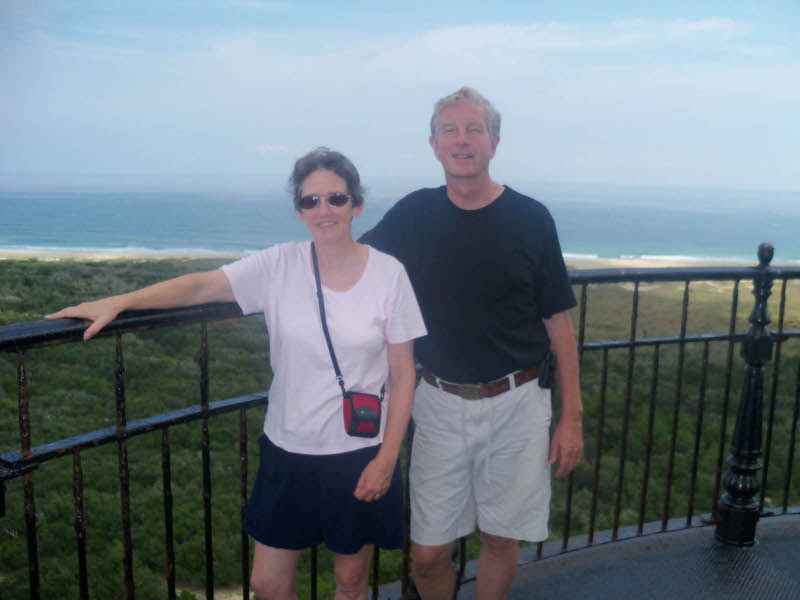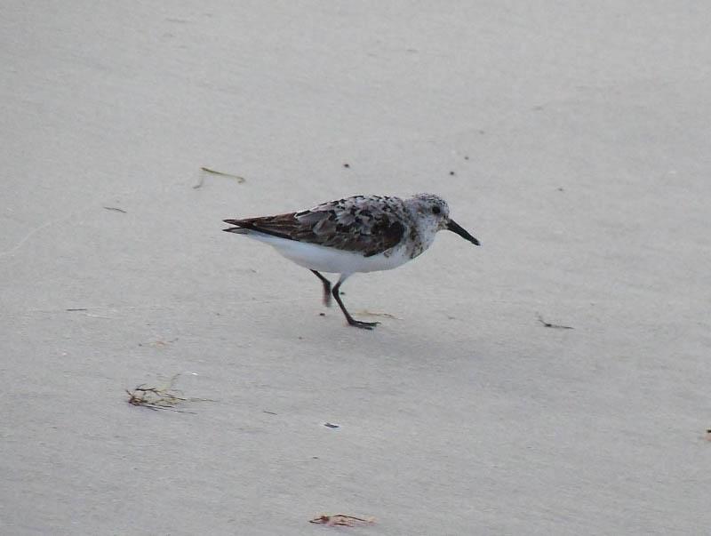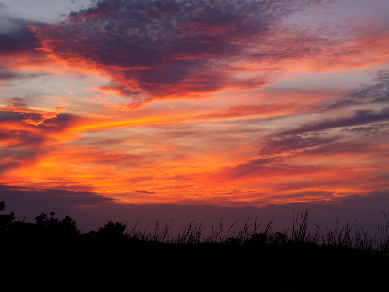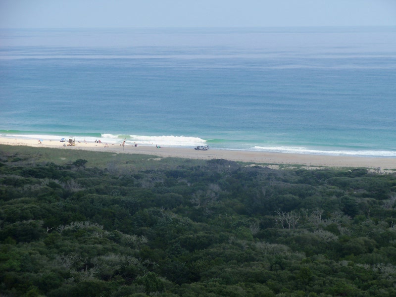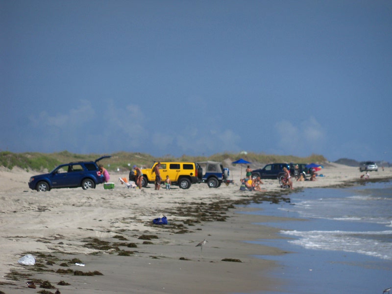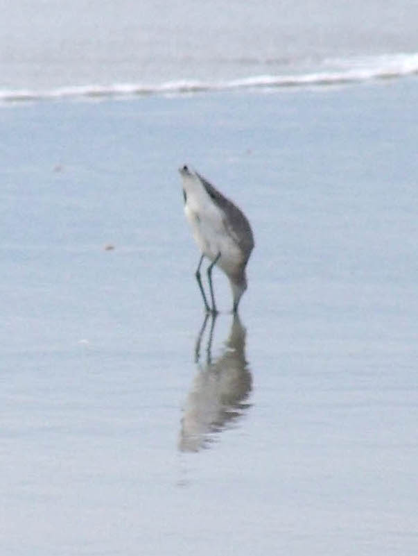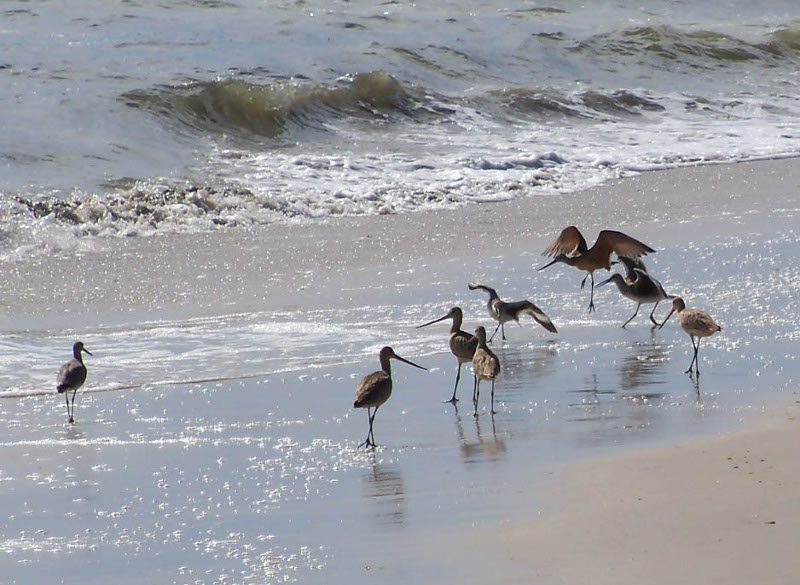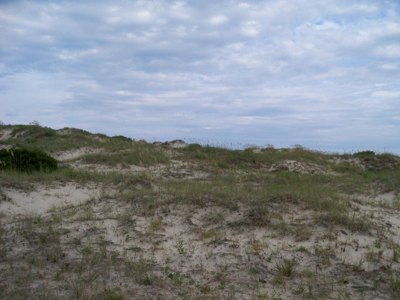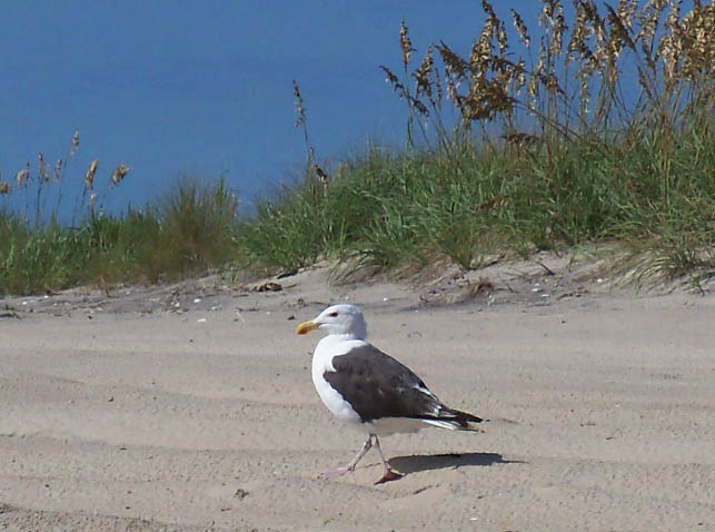 shoes!We set up camp and went to "walk the beach" which is how we spend a lot of time when we're at the shore. Scaling the dunes (at right above) was a little strenuous but good for us! We were surprised at the number of SUV's and pickups down on the beach. It would not have occurred to me that was even allowed, but apparently it is. They line up with the backs open to the water and tailgate! Below are some of our favorite shore birds: a group of willets (unusual - they are typically pretty solitary), a great black backed gull (the largest gull in the world) and a sanderling. After we cleaned up, we went to South Beach Grill for dinner. The prices were moderate for the location, and the food was great! We had some coconut shrimp for an appetizer, then I had South Beach veggie pasta and John had fish (mahi mahi) tacos. Back at camp, there were so many hungry mosquitos we just climbed into the tent, and, after killing about a dozen that snuck in with us, we went to bed early. I got up and went to the rest room before midnight and it was beautiful out - the sky was full of stars. But later on the storms rolled in! Our tent, a Kelty dome tent, really proved its worth. It