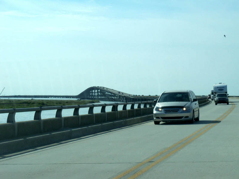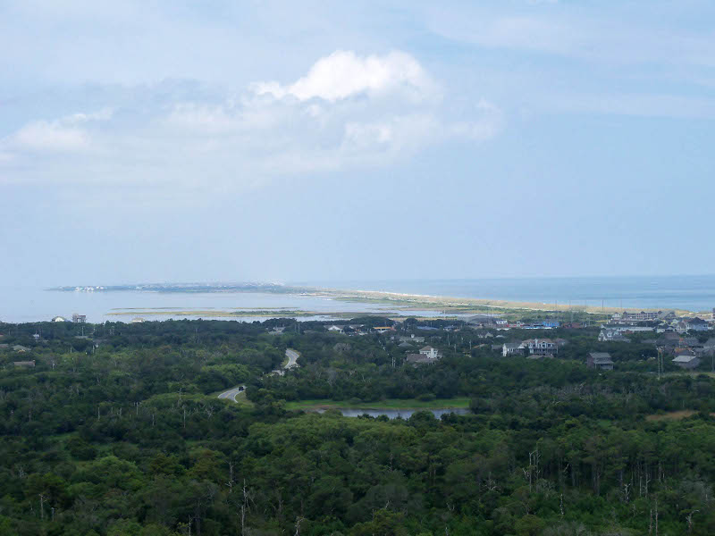 There is a fire still smoldering at the Great Dismal Swamp and today the wind was evidently blowing north and east because we drove through lots of smoke. In fact, our "check engine" light came on but went back off the next day and never came back so we are guessing it was related to the heavy smoke. The picture to the right is crossing the Wright Memorial Bridge from the mainland to the Outer Banks. We