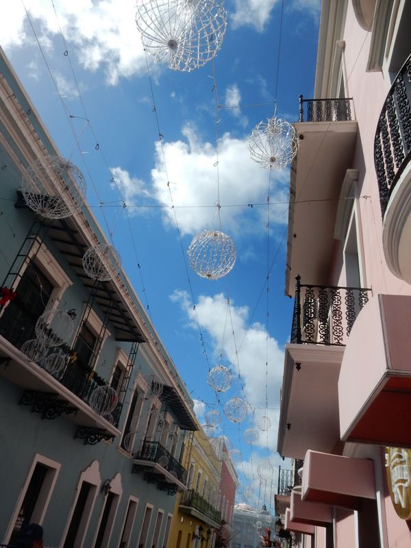 PuertoRico -- Fortaleza Street - the globes are lit at night (Display changes seasonally)