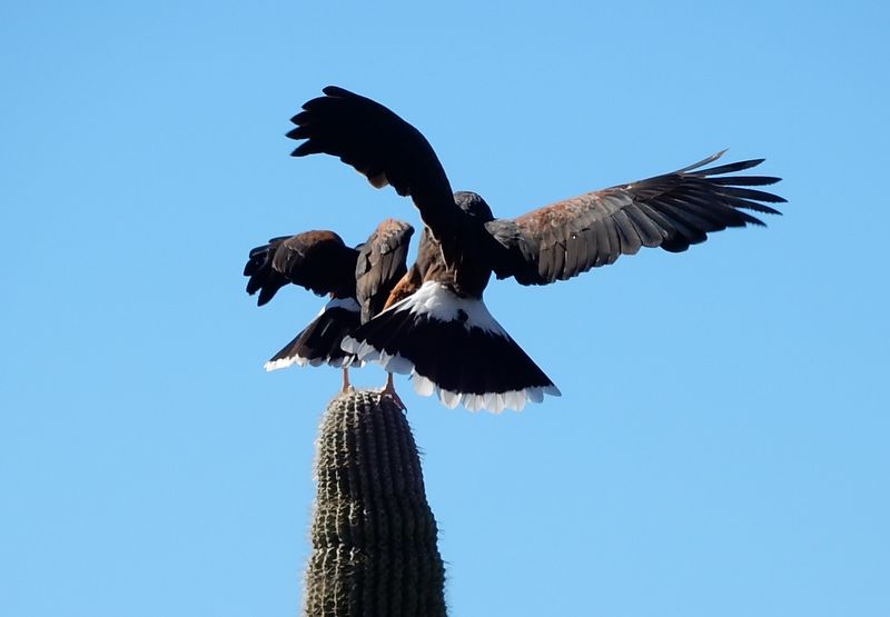 Arizona-SonoraDesertMuseum -- Harris hawks bickering over the "top spot"