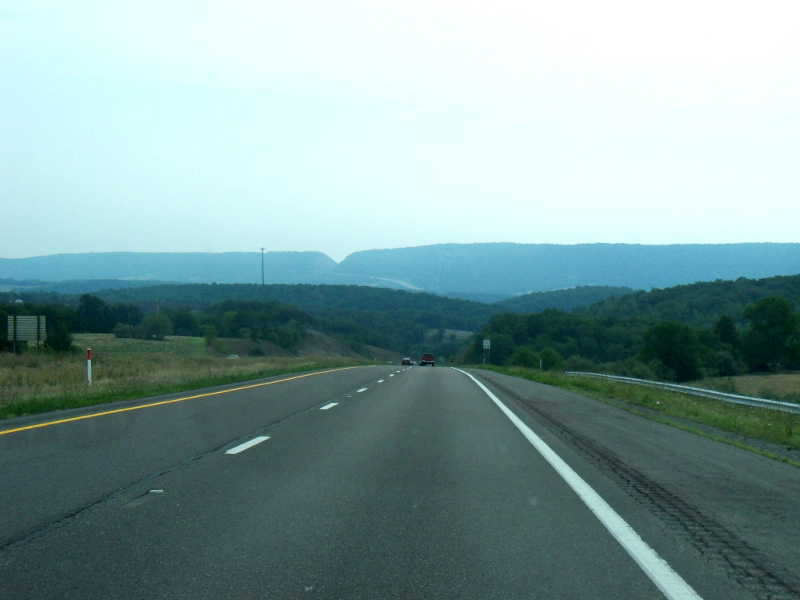 a little and left around 9 AM. Saturday August 13: Crossing into Maryland is where we finally got into a scenic route! The first picture (above, right) is just beyond Exit 4 near Friendsville, MD. That has to be a branch of the Youghiogheny River. In the picture above left, you can see the 340 foot notch in the Allegheny Mts just west of Hancock known as the Sidling Hill Cutout. The two pictures below were taken at a rest area there at Sidling Hill: the cutout itself and a praying mantis who was as interested in me as I was in him. ![]() So,